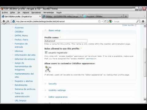 3) Una vez instalado el CKeditor lo siguiente que hemos hecho ha sido desactivar el FCKeditor que teníamos antes instalado, y hemos procedido a asignar permisos de acceso al nuevo editor, y a configurar las opciones del editor.